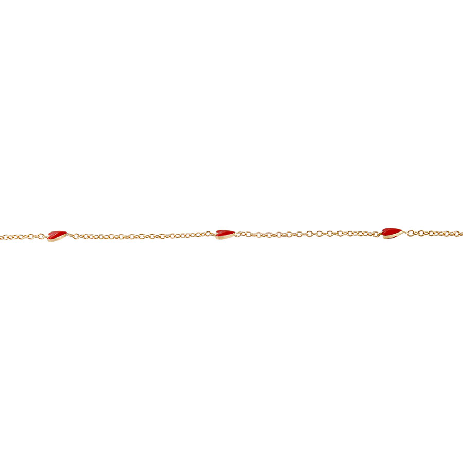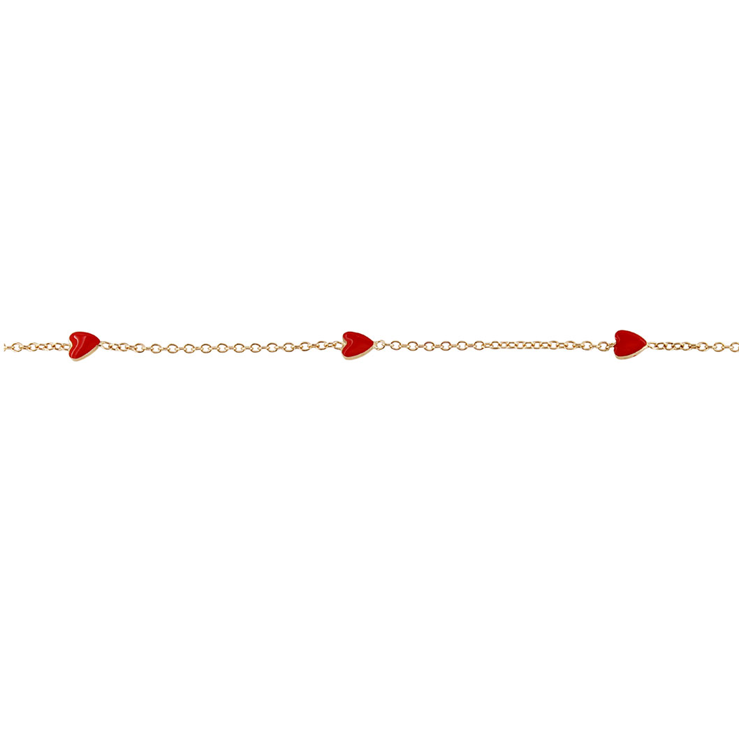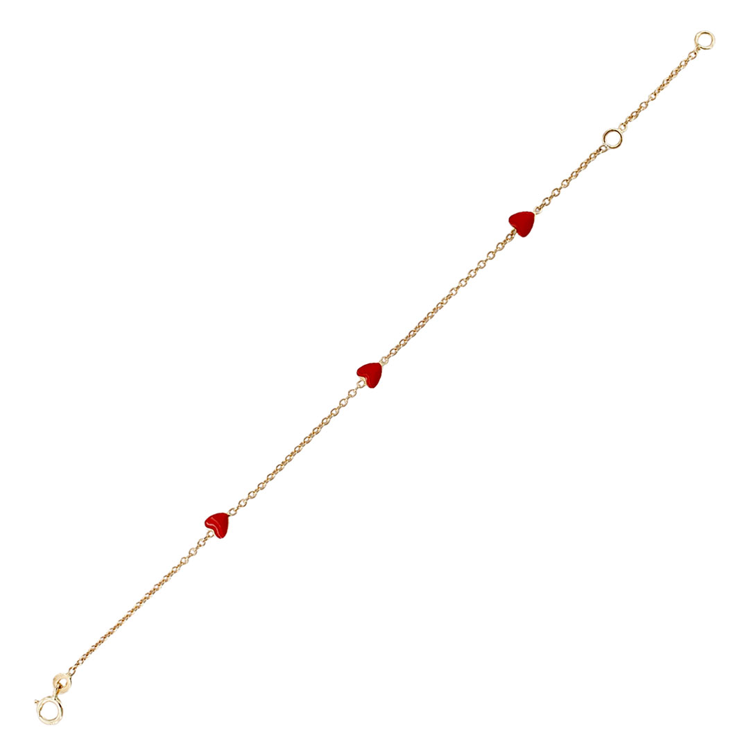 Bracciale Bimba in Oro Giallo 18 kt lucido con Cuori Rossi Smaltati da 4 mm, Chiusura a A Moschettone in Oro 18 kt, Lunghezza 14 cm (Fino a 8 anni) con anelletto per chiusura a 12 cm. Made in Italy. Venduto in confezione elegante con certificato.