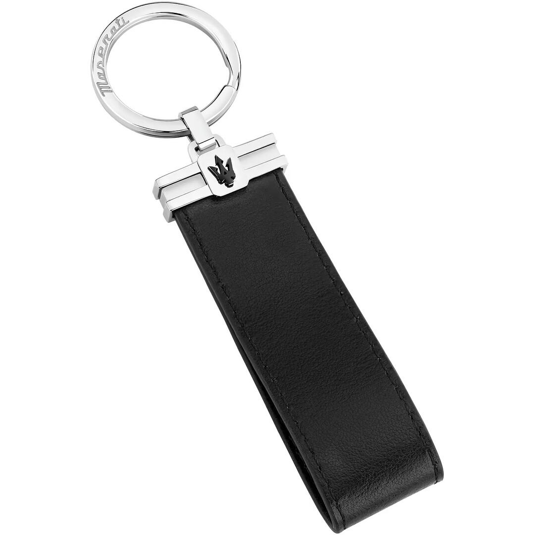 Portachiavi Maserati in Pelle Nera e Anello in acciaio inossidabile e Logo in PVD nero.