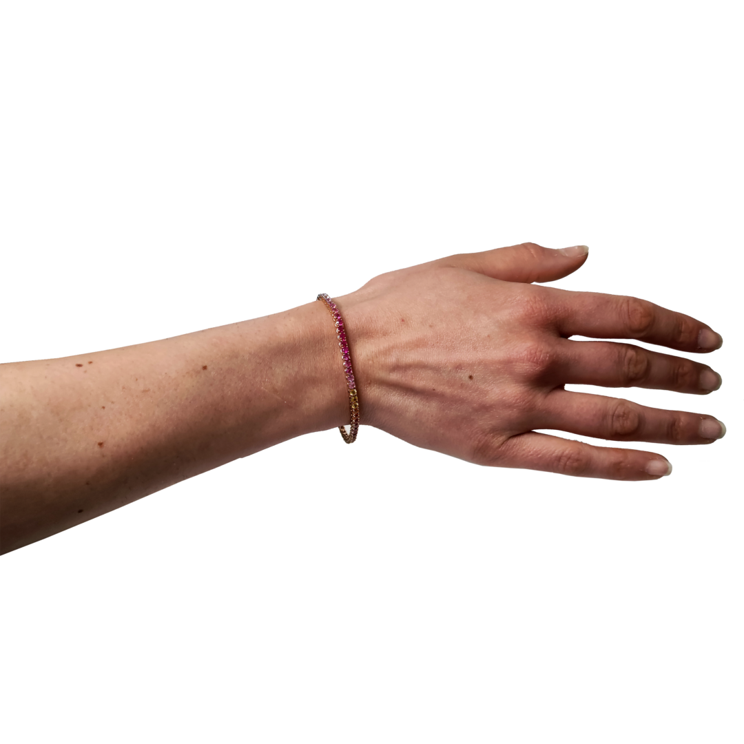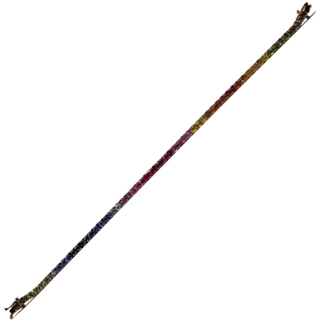 Bracciale Tennis Da Donna di Nostra produzione Della Collezione “Arcobaleno” in Oro Rosa 18 kt con Zaffiri naturali selezionati taglio brillante di vari colori da 4,40 ct. Chiusura a scomparsa con doppi ganci di sicurezza. Lunghezza totale 20 cm. Venduto in elegante Confezione in legno a LED con Certificato di Autenticità.