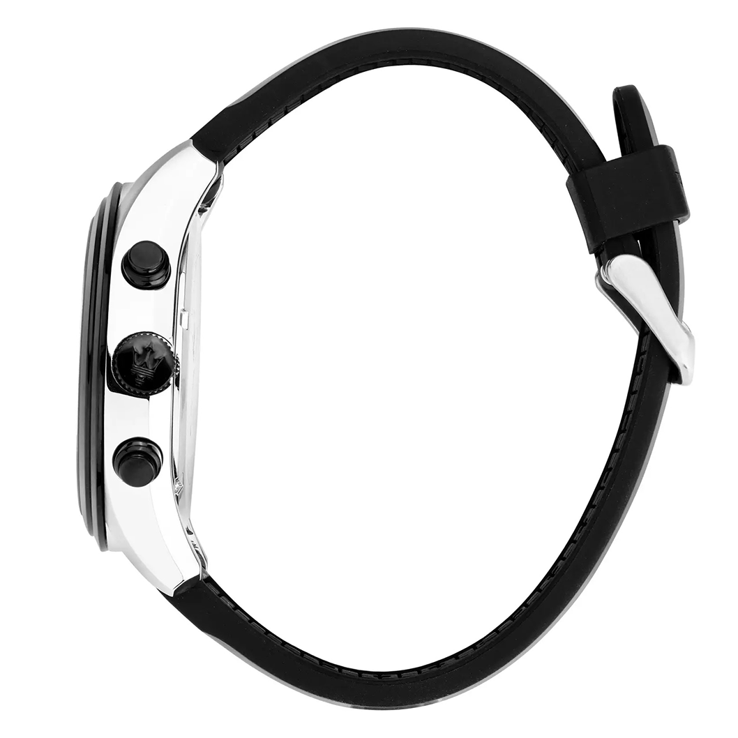 Orologio da Uomo Maserati della collezione Traguardo con Movimento Miyota JS50 Cronografo al Quarzo, Cassa In Acciaio da 45 mm, Corona a Vite con Logo, Cinturino in Poliuretano con Chiusura Fibbia ad ardiglione, Resistenza allโacqua 10 atm (100m), Garanzia Ufficiale 2 anni e Confezione Originale Maserati.
