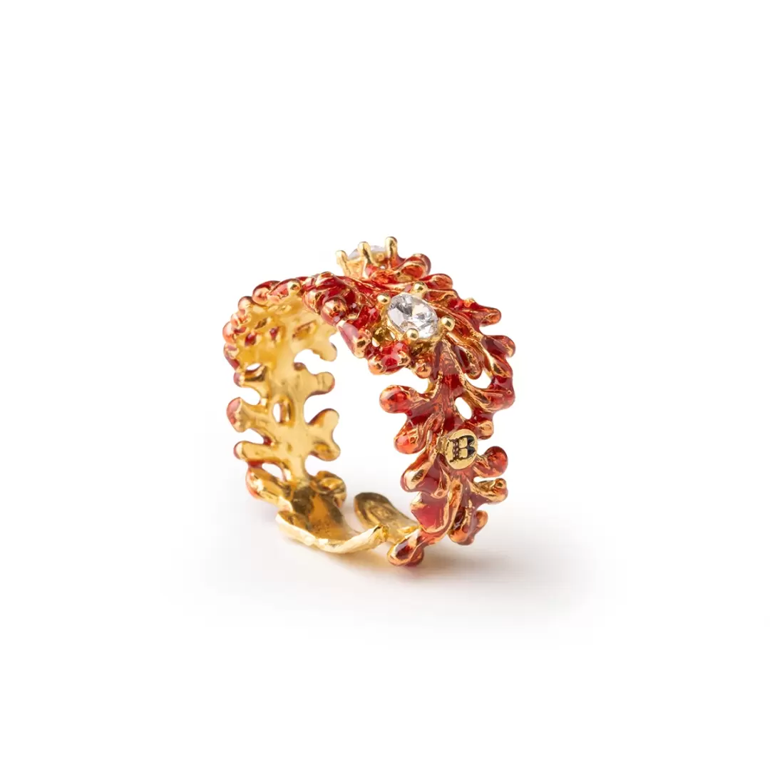 “Basiluzzo, gemma selvaggia delle Isola Eolie, incanta con la sua bellezza incontaminata e un’aura misteriosa. Ispirata a quest’isola leggendaria, questo anello unisce l’intensitร del corallo rossoโsimbolo di vita e passioneโalla forza della natura.”