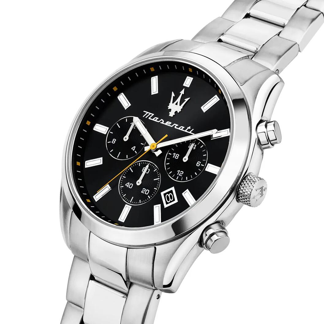 Orologio da Uomo Maserati della nuova collezione Attrazione con Movimento Cronografo al quarzo, Cassa In Acciaio da 43 mm, Corona con Logo, Bracciale in Acciaio con Chiusura a Deployante con gancio di sicurezza, Resistenza all’acqua 5 atm (50m), Garanzia Ufficiale 2 anni e Confezione Originale Maserati.