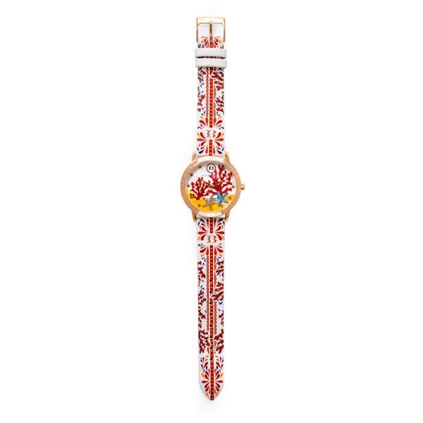 Le forme sinuose del corallo risplendono nel quadrante di questo orologio, reso ancora piรน prezioso dalle 11 pietre luminose che, insieme al logo, ne scandiscono le ore.