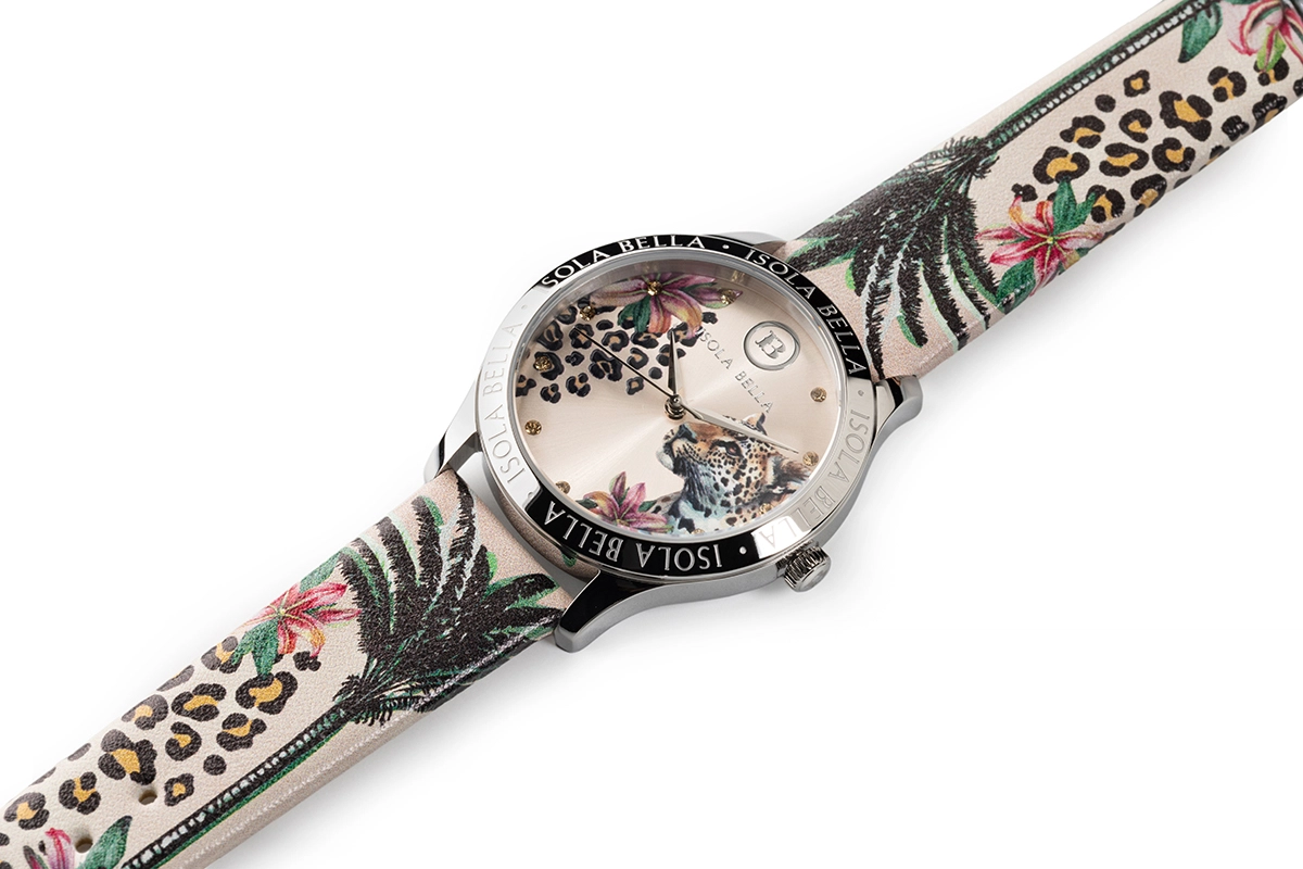 Afferma la tua personalità con l’Orologio Ghepardo, un pezzo della collezione watch Isola Bella che celebra la bellezza felina e selvaggia. Caratterizzato da un design d’impatto, questo orologio accosta l’eleganza del predatore più veloce del mondo a dettagli floreali tropicali, creando un equilibrio perfetto tra forza e grazia. Un accessorio magnetico, ideale per chi vive la moda come un’avventura quotidiana.