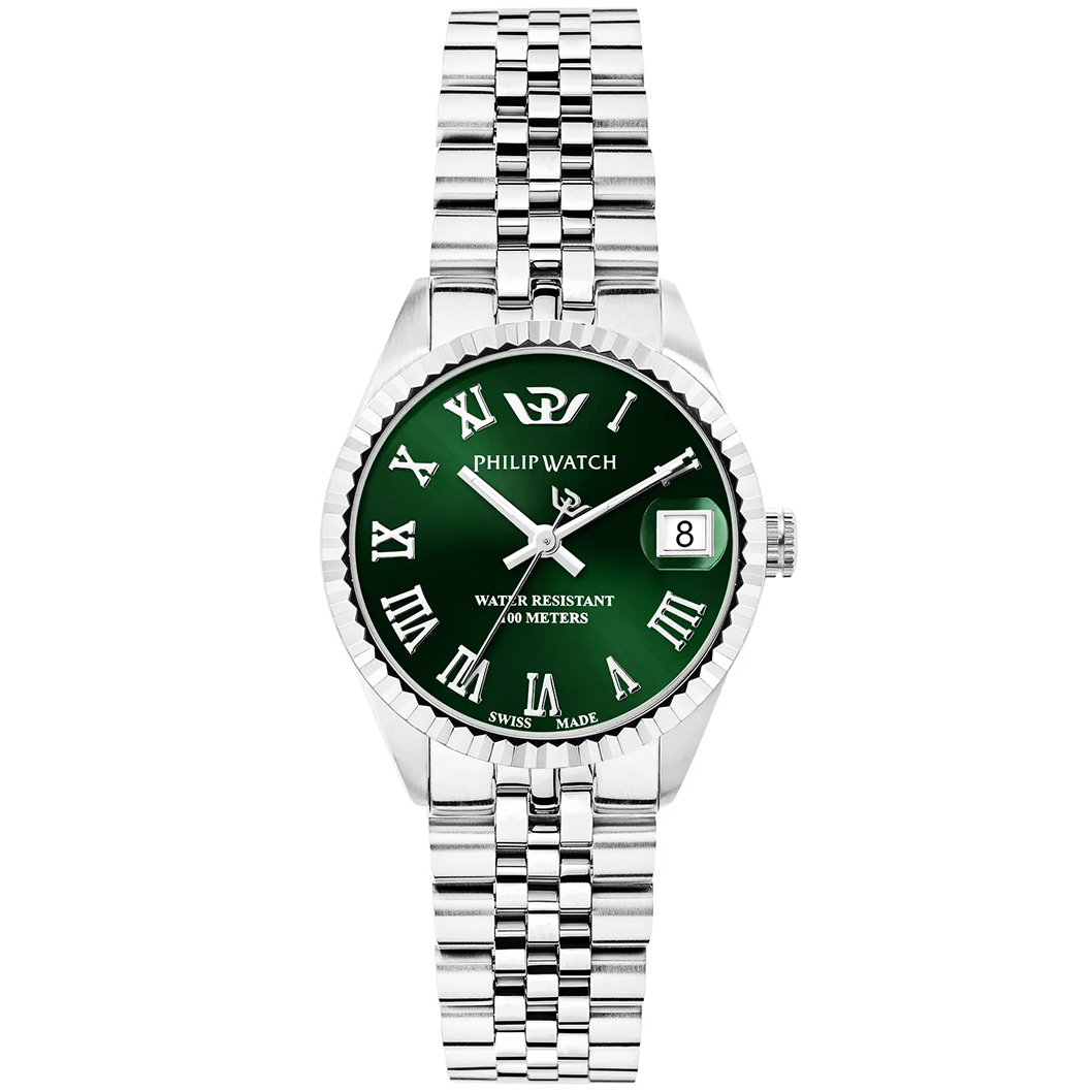 Orologio da Donna Philip Watch della collezione Caribe, Cassa in Acciaio lucido da 31 mm, Fondo serrato a vite con Movimento al Quarzo ETA F05.115, Vetro Zaffiro, Cinturino Jubilรจe in Acciaio, Chiusura Fibbia a deployante con clip di sicurezza, Water resistant: 10 atm, Garanzia Ufficiale 2 anni e Confezione Originale Philip Watch.