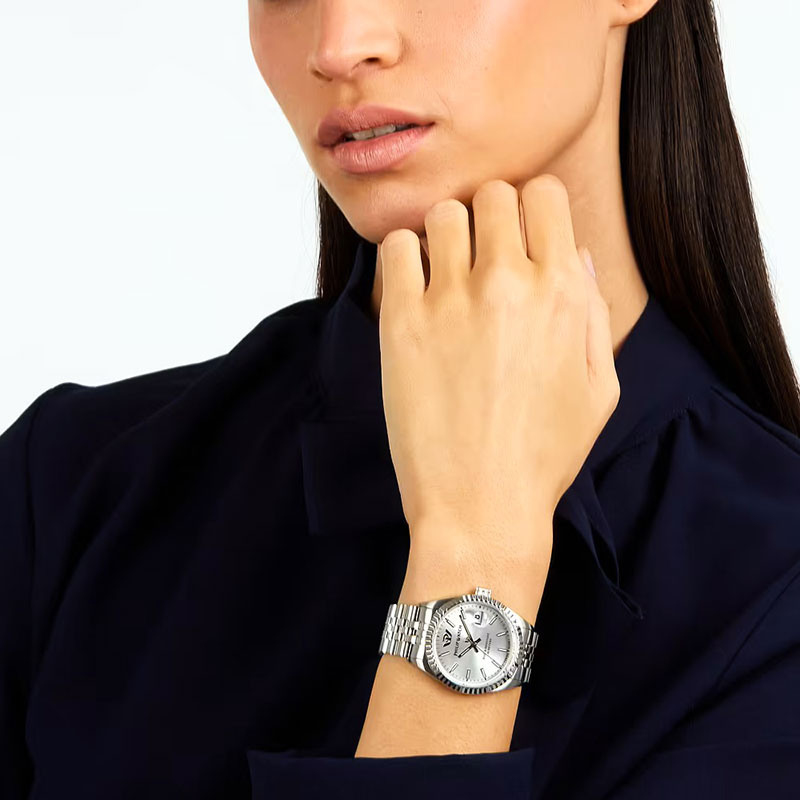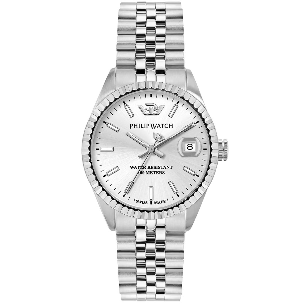 Orologio da Donna Philip Watch della collezione Caribe, Cassa in Acciaio lucido da 35 mm, Fondo serrato a vite, Vetro Zaffiro, Cinturino in Acciaio Argento Jubilรจe, Chiusura Fibbia a deployante con clip di sicurezza, Water resistant: 10 atm, Garanzia Ufficiale 2 anni e Confezione Originale Philip Watch.