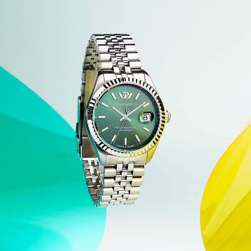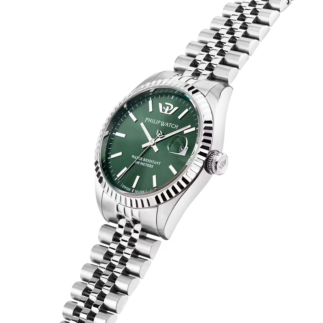 Orologio da Donna Philip Watch della collezione Caribe, Cassa in Acciaio lucido da 35 mm, Fondo serrato a vite, Vetro Zaffiro, Cinturino in Acciaio Argento Jubilรจe, Chiusura Fibbia a deployante con clip di sicurezza, Water resistant: 10 atm, Garanzia Ufficiale 2 anni e Confezione Originale Philip Watch.