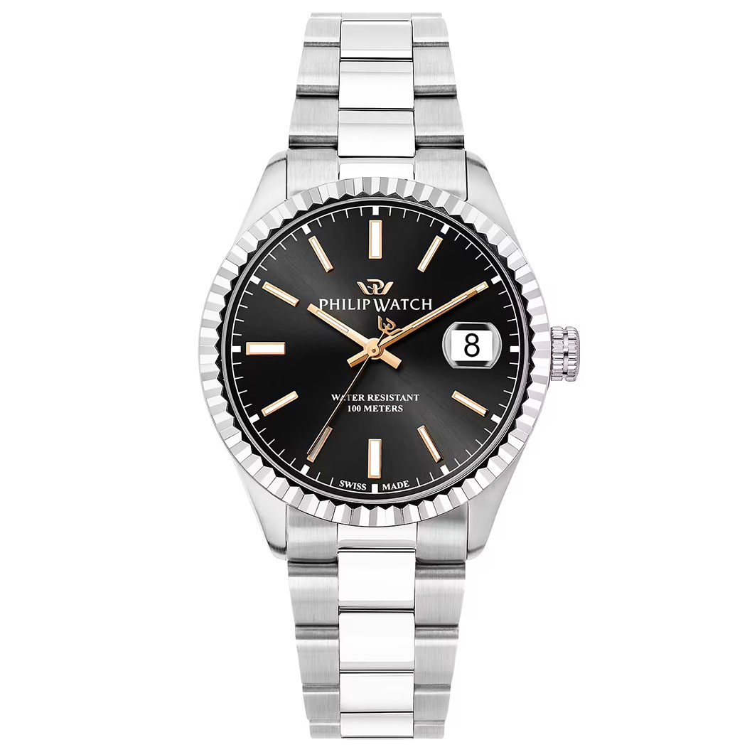 Orologio da Uomo Philip Watch della collezione Caribe, Cassa in Acciaio lucido da 39 mm, Fondo serrato a vite, Vetro Zaffiro, Cinturino in Acciaio inossidabile, Chiusura Fibbia a deployante con clip di sicurezza, Water resistant: 10 atm, Garanzia Ufficiale 2 anni e Confezione Originale Philip Watch.