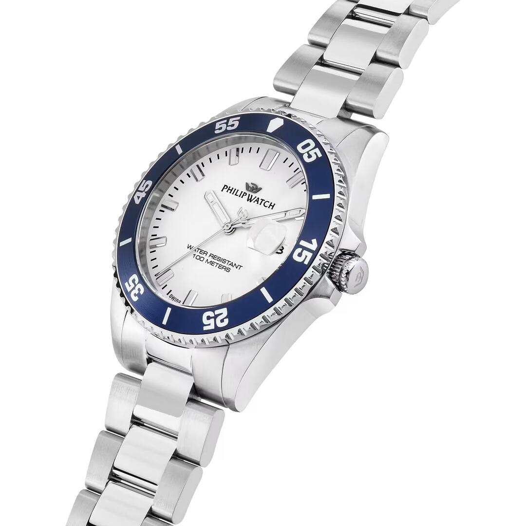 Orologio da Uomo Philip Watch della collezione Caribe sport, Cassa in Acciaio lucido da 42 mm, Fondo serrato a vite, Vetro Zaffiro, Cinturino in Acciaio Argento , Chiusura Fibbia a deployante con clip di sicurezza, Water resistant: 30 atm, Garanzia Ufficiale 2 anni e Confezione Originale Philip Watch.
