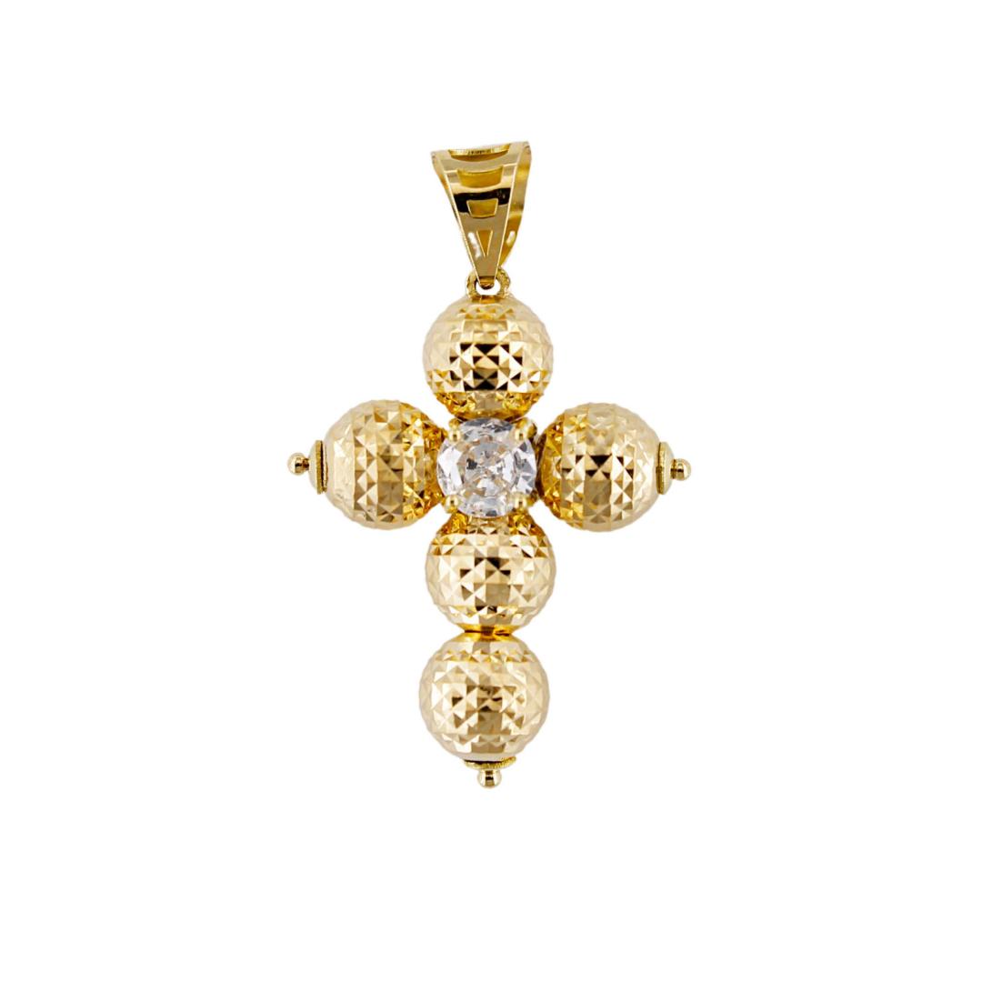 Ciondolo Collana Croce Sfere 5 mm In Oro Giallo 18 kt Diamantate Laser