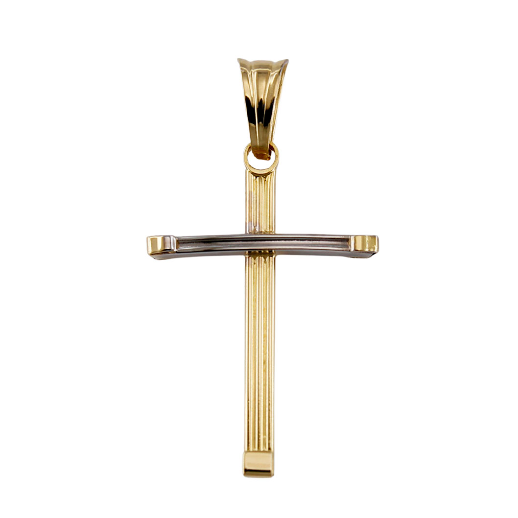 Ciondolo Pendente per collana forma Croce in Oro Giallo e Bianco 18 kt.ย Misura 1,80 x 2,70 cm + 8 mm di anelletto passante (anch’esso in oro 18 kt). Venduta in Elegante Confezione con certificato di Oro 750/1000 e garanzia a vita.