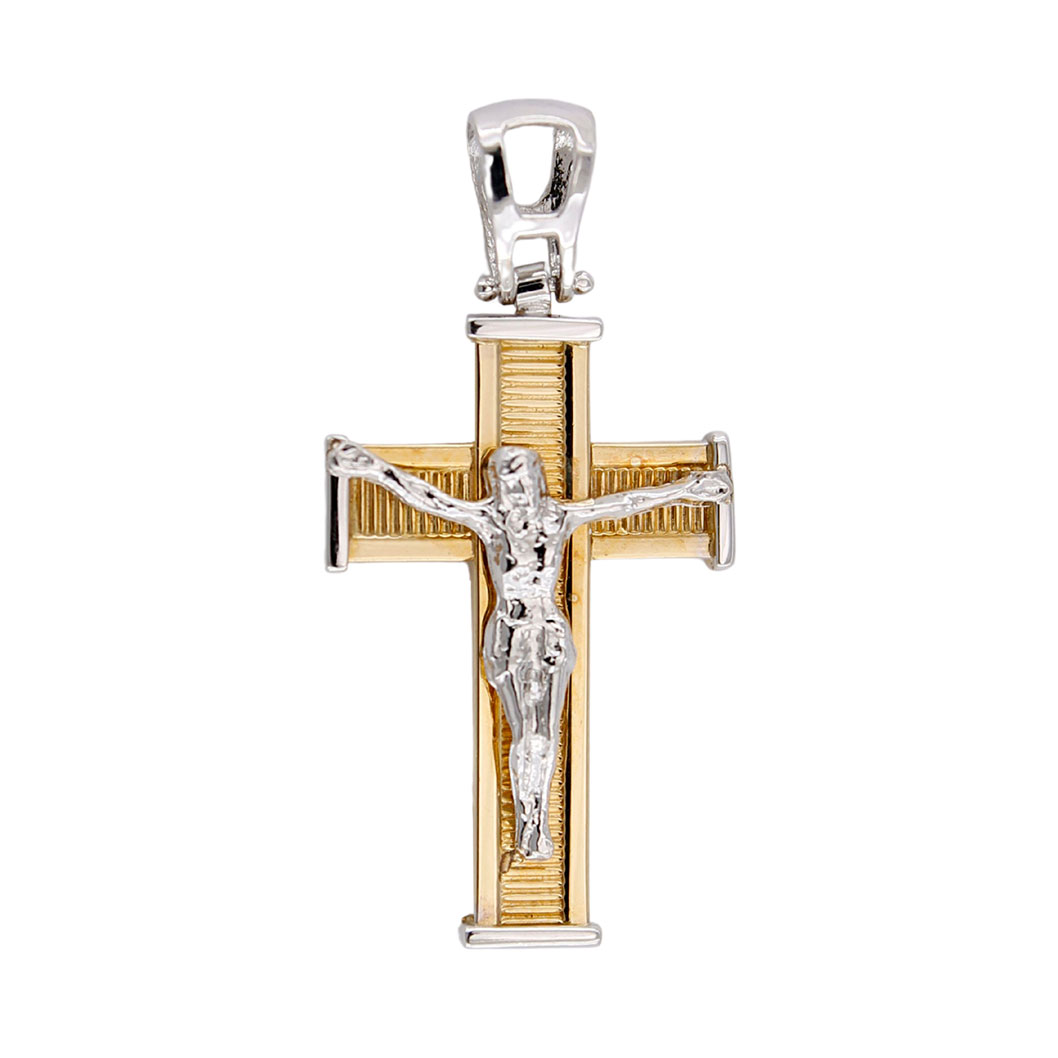 Ciondolo pendente forma Croce con Gesù in Oro Giallo e Bianco 18 kt, Finitura laser di ultima generazione.