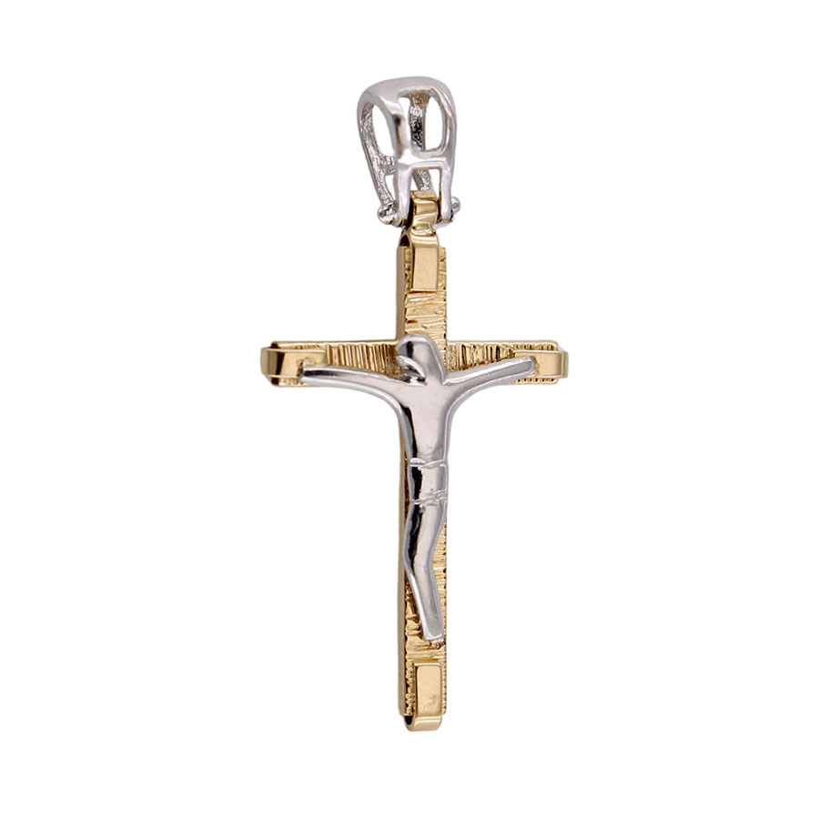 Ciondolo pendente per Collana forma Croce in Oro Giallo 18 kt lucido Finiture Laser con Gesù in Oro Bianco 18 kt lucido.