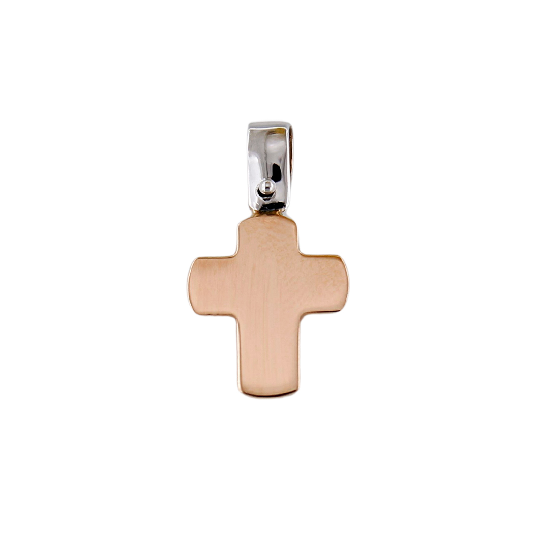 Ciondolo Pendente per Collana Forma Croce Bombata in Oro Rosa 18 kt.ย Misura 1,20 cm x 1,60 cm+ 7 mm di anelletto passante in oro bianco. Venduta in Elegante Confezione.