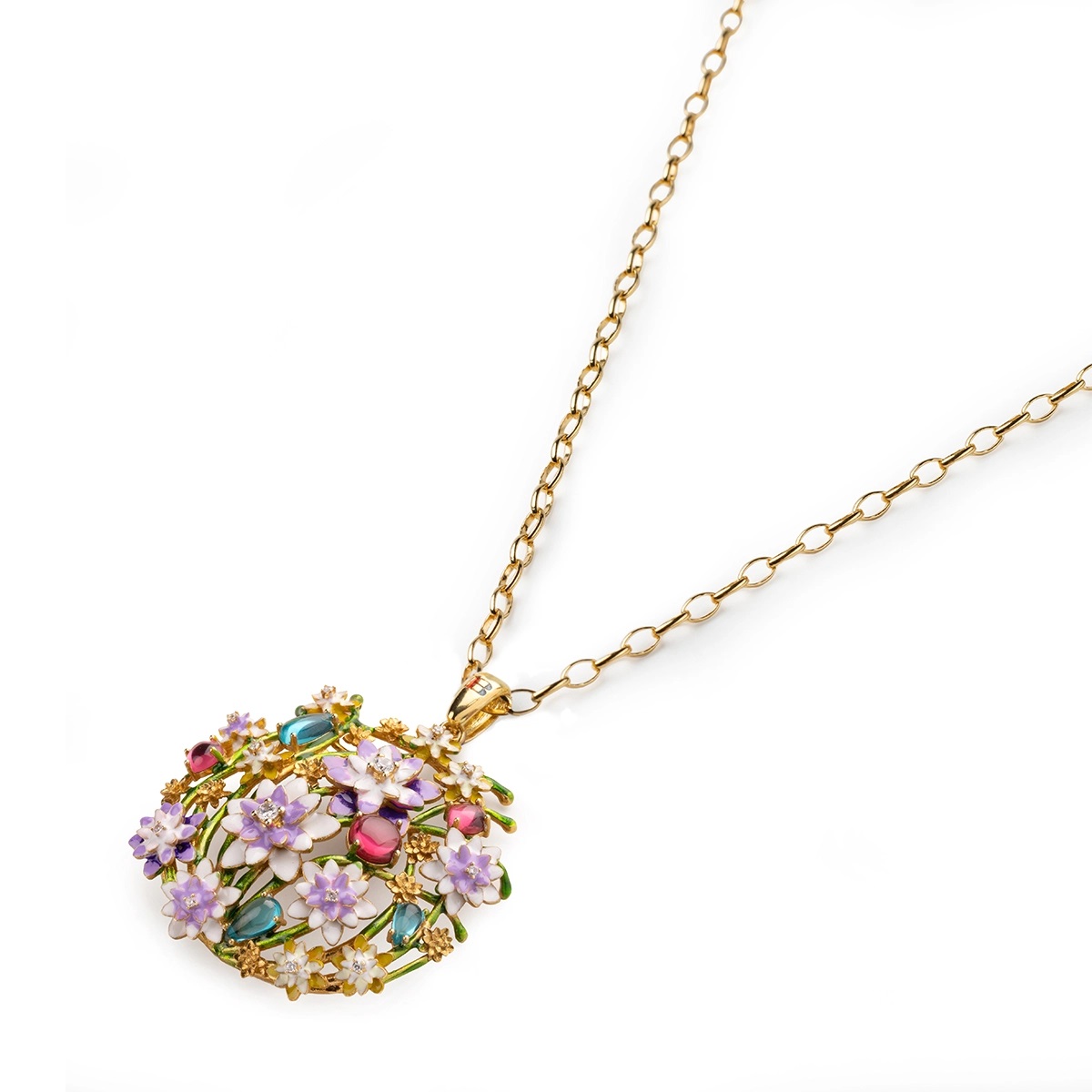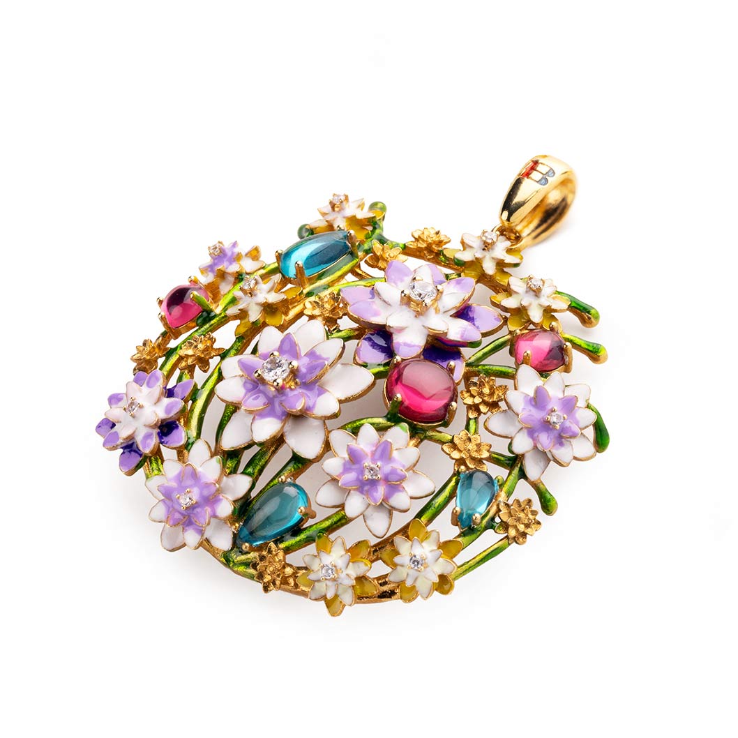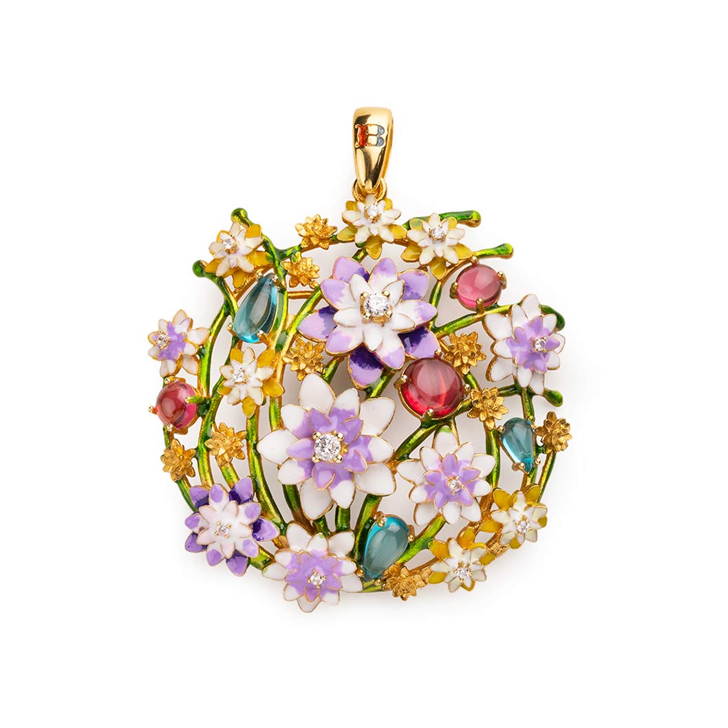 Con i suoi dettagli, i suoi colori delicati e la luce delle gemme che lo adornano, il ciondolo Fonte Aretusa รจ una creazione unica e preziosissima.