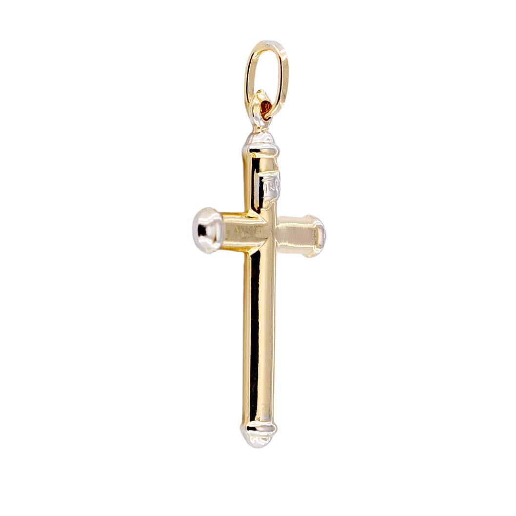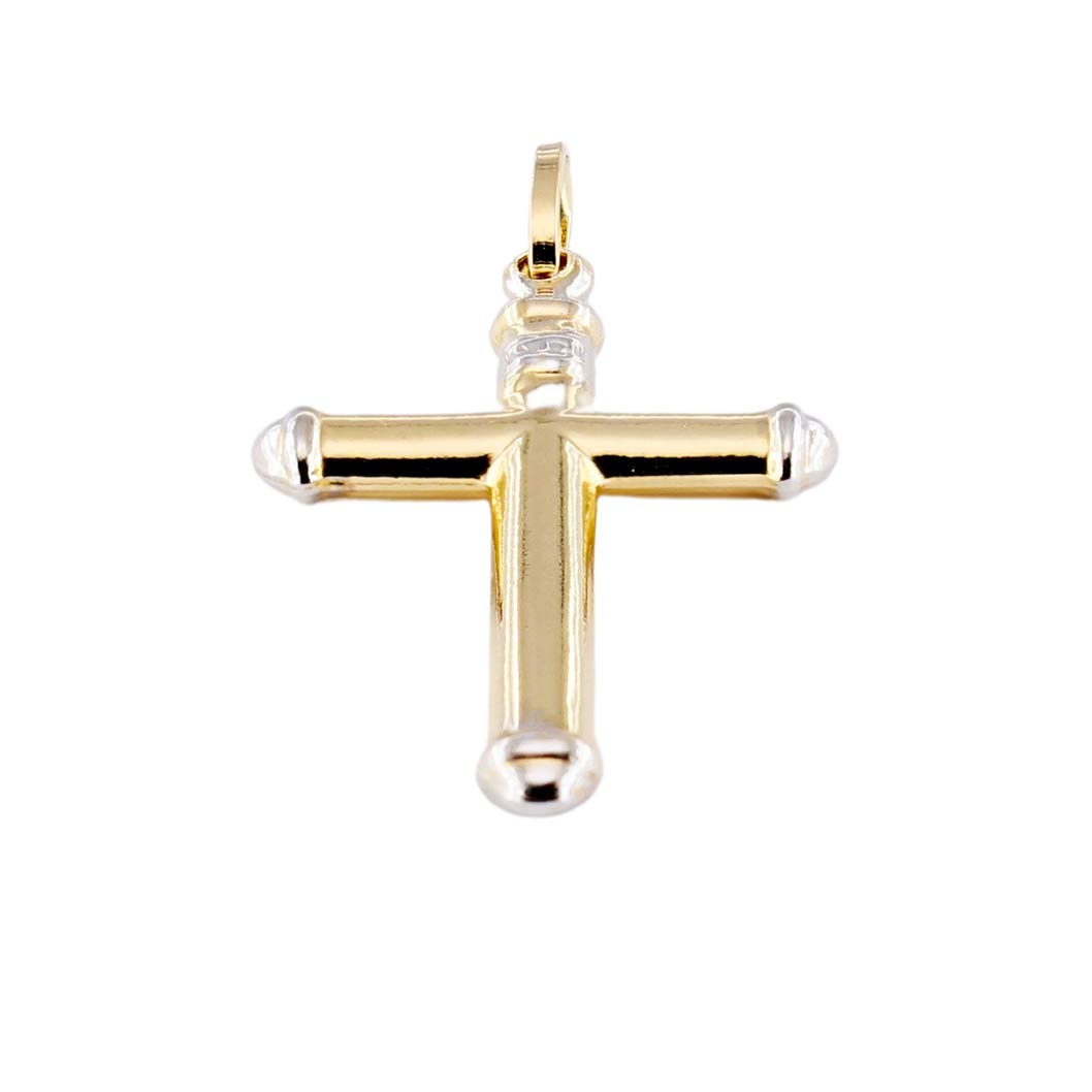 Ciondolo Pendente Forma Croce Bombata Moderna in Oro Giallo 18 kt con laterali in Oro Bianco 18 kt. Misura 2 x 3 cm.
